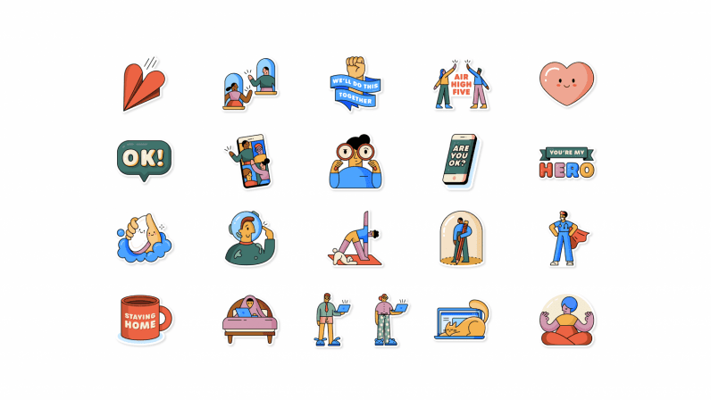 These stickers show some aspects of staying at home including washing hands, working from home, spreading love, social distancing, and appreciating healthcare staff.
